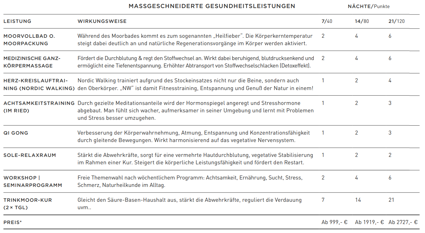 Gesundheitsleistungen entsprechend der gewählten Angebotsdauer (in Absprache mit unserem Ärzteteam individuell an Ihr jeweiliges Krankheitsbild angepasst)