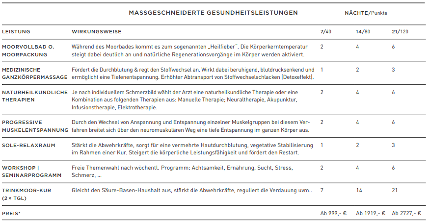 | Trinkmoor-Kur (2x täglich) | Gleicht den Säure-Basen-Haushalt aus, stärkt die Abwehrkräfte, reguliert dei Verdauung uvm... | 7 | 14 | 21 |